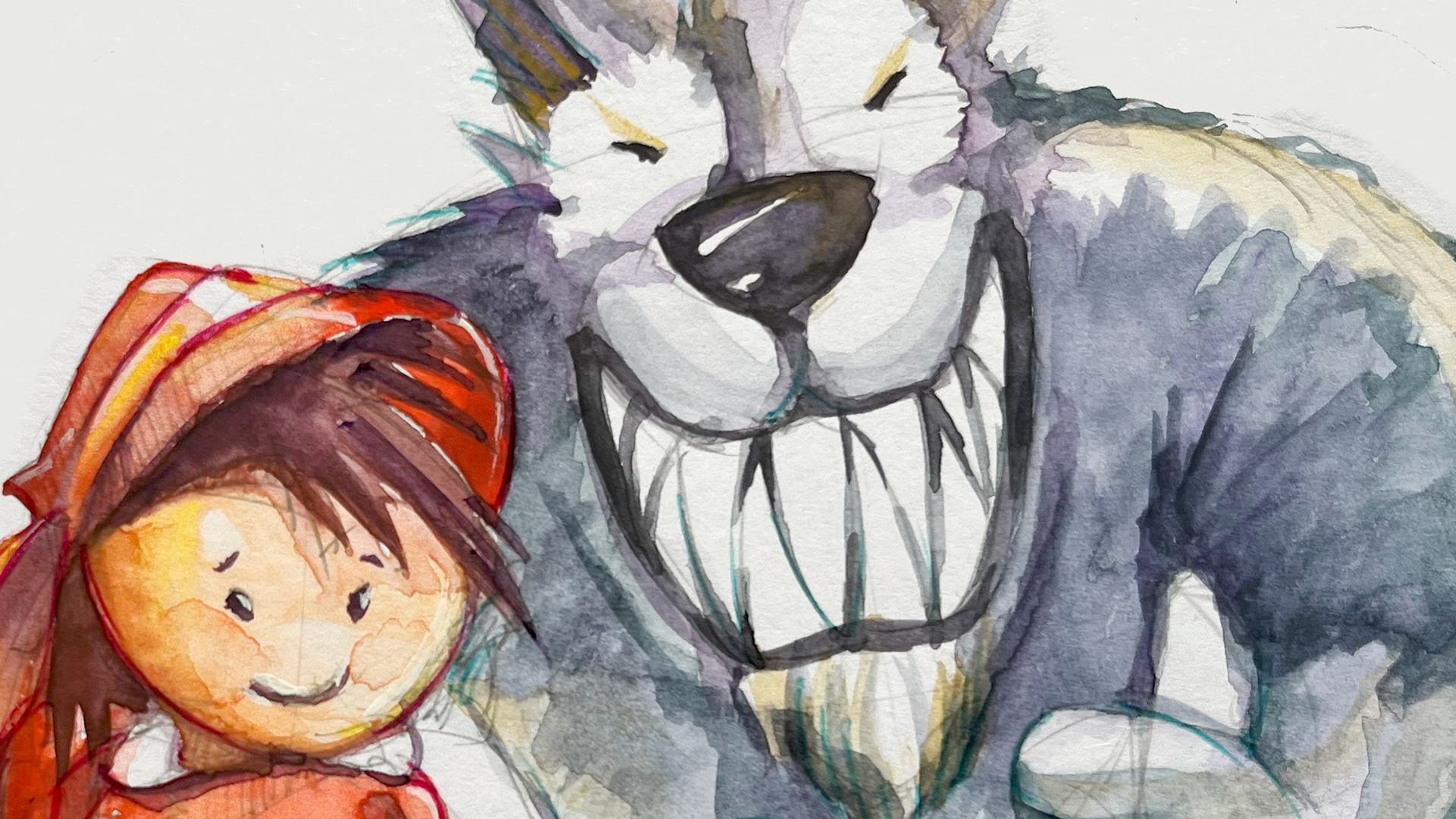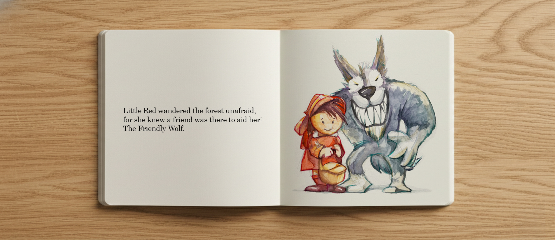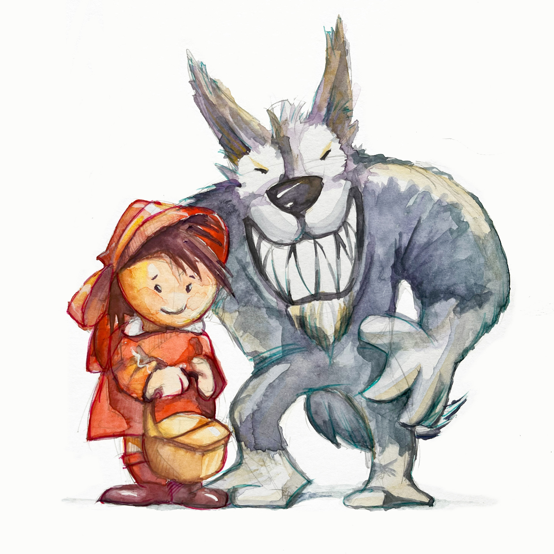 A children's book, telling a new version of Little Red Riding Hood and her great friend, the Wolf. The illustrations were finished in watercolor and gouache over the graphite sketches, which were not erased.